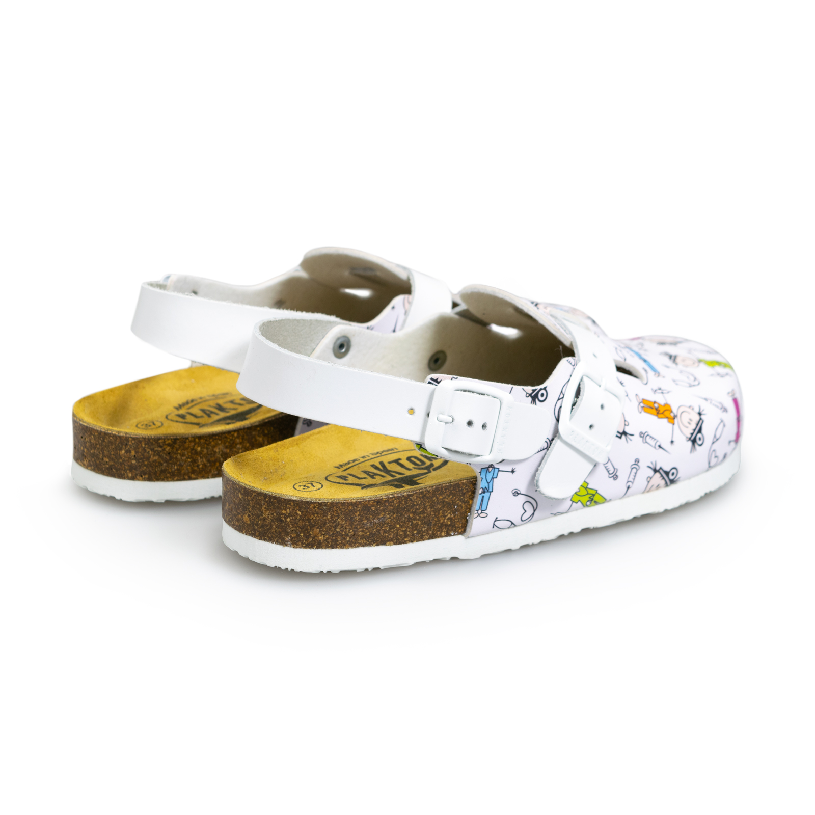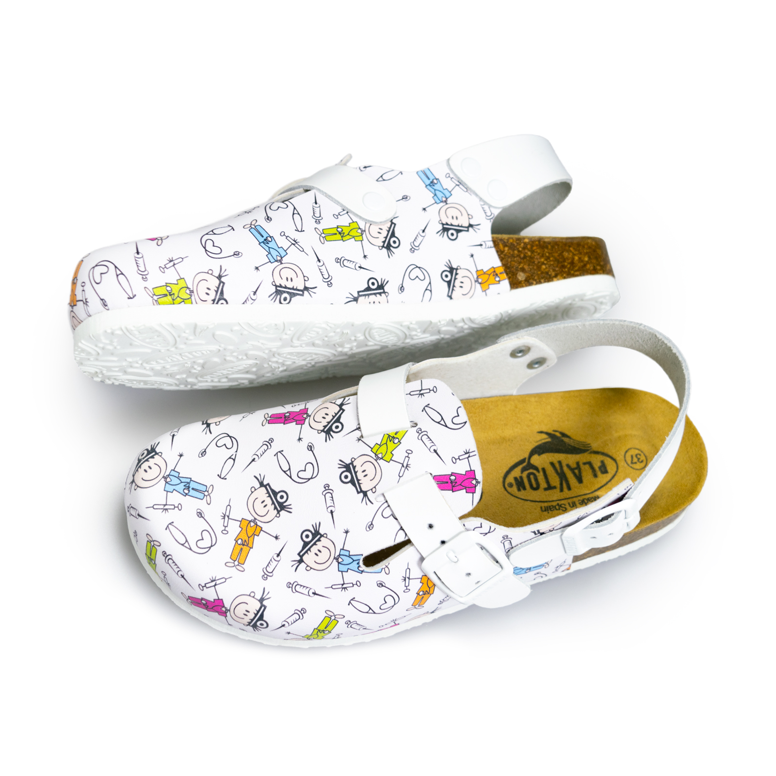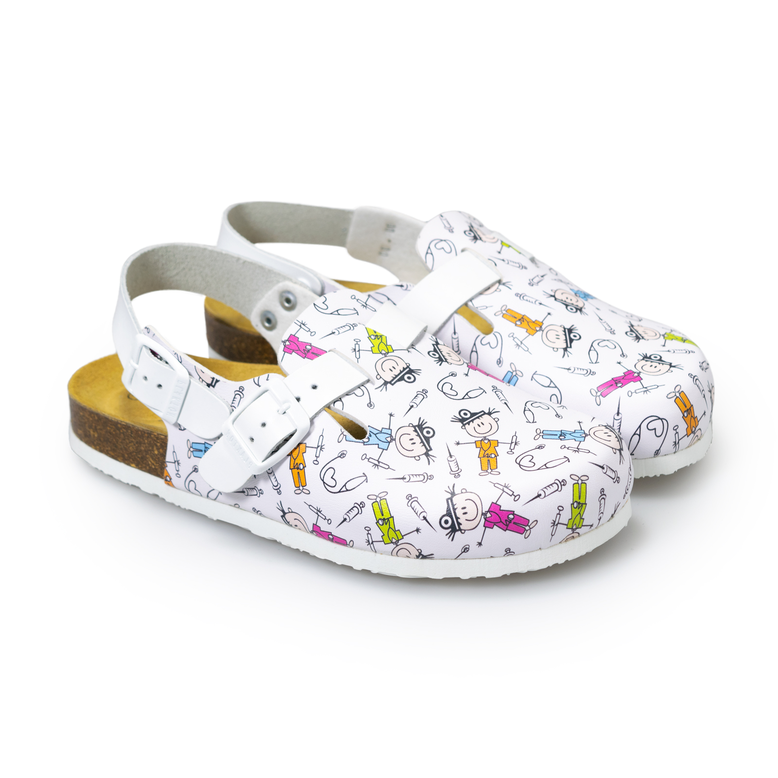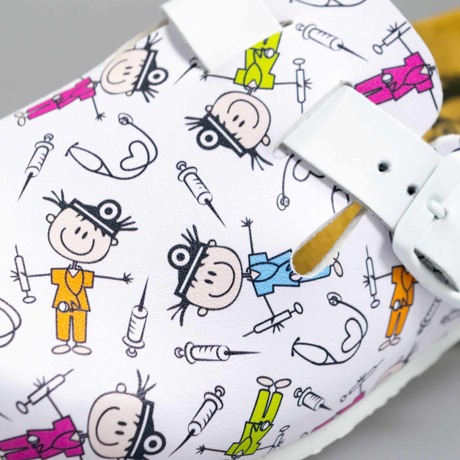 Un zueco todorreno. Muy cómodo y funcional. Práctico. Así es el zapato BIO Gute Besserung de Cálzame. Diseñado especialmente para profesionales que necesitan un zueco laboral confortable, este zapato de fácil cuidado luce un estampado divertido con motivos y dibujos alegres de médicos/as y enfermeras/os.